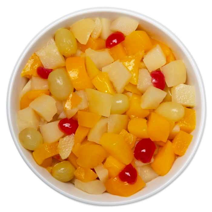 Puuviljad (virsik, pirn, ananass, viinamari, kirsid (värvitud värvainega E-127)), vesi, suhkur, happesuse regulaator E-330